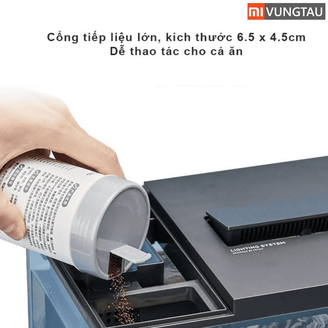 Kích thước cổng cho ăn là 6.5 x 4.5cm được bố trí ở mặt trên, không chỉ thuận tiện hơn cho việc cho cá ăn mà bạn còn có thể cho cá nhỏ mới bắt vào một các linh hoạt mà không cần phải rút nguồn hay mở nắp.