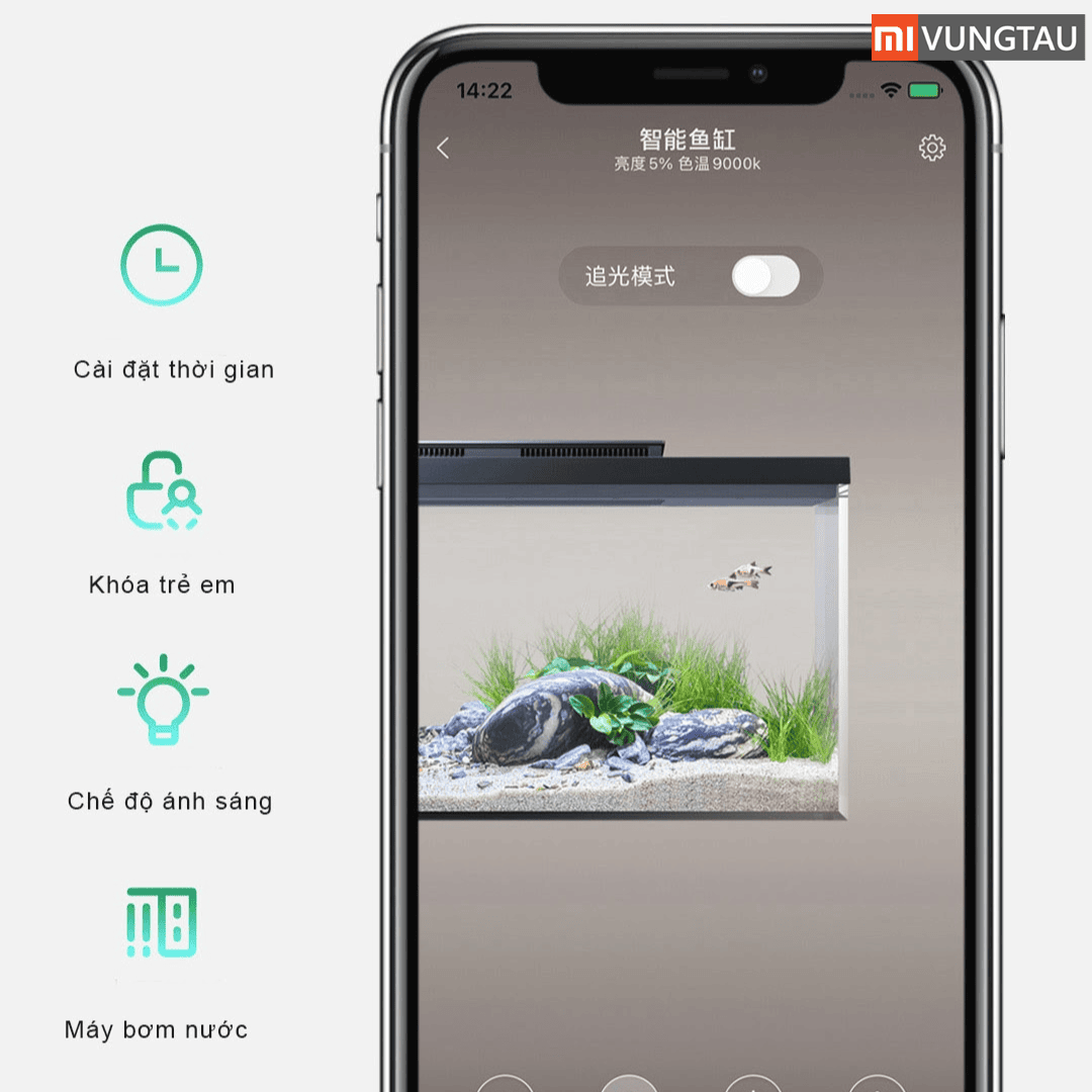 Hồ thủy sinh phòng khách này còn được trang bị tính năng điều khiển bằng APP. Người dùng có thể tải xuống ứng dụng thông minh ngay trên điện thoại và kết nối với bể cá thông qua kết nối bluetooth. Trên ứng dụng điện thoại bạn có thể dễ dàng cài đặt, tùy chỉnh ánh sáng và máy bơm nước, khóa trẻ em,…một cách dễ dàng.