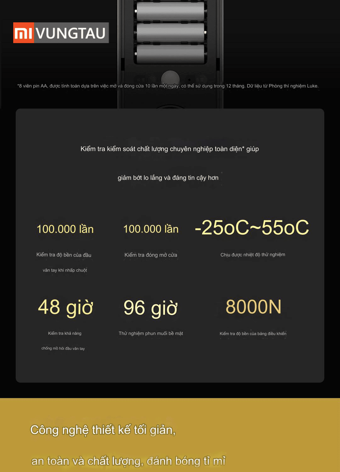 Mặt trước khóa được làm bằng kính cường lực cường độ cao, chống cháy nổ, chống bám bẩn, trầy xước, ăn mòn, các tác nhân phá hoại bên ngoài. Bàn phím cảm ứng tích hợp hoàn toàn ẩn trong bảng điều khiển. Đèn nền bàn phím sẽ được bật lên tự động khi bạn sử dụng giúp các thao tác mở khóa dễ dàng ngay cả trong điều kiện đêm tối thiếu ánh sáng. Phần thân khóa được gia công, chế tác từ vật liệu hợp kim thép cao cấp, trải qua quá trình kiểm soát nghiêm ngặt cùng hàng trăm các thí nghiệm về khả năng chịu lực cho ra báo cáo kết quả chịu lực lên đến 8000N, cường độ chịu kéo (tensile strength) 280MPa, đạt trạng thái giới hạn chảy (yelding strength) 230 MPa. Vì vậy, các tác nhân tác động lực từ bên ngoài gần như bất khả xâm phạm!