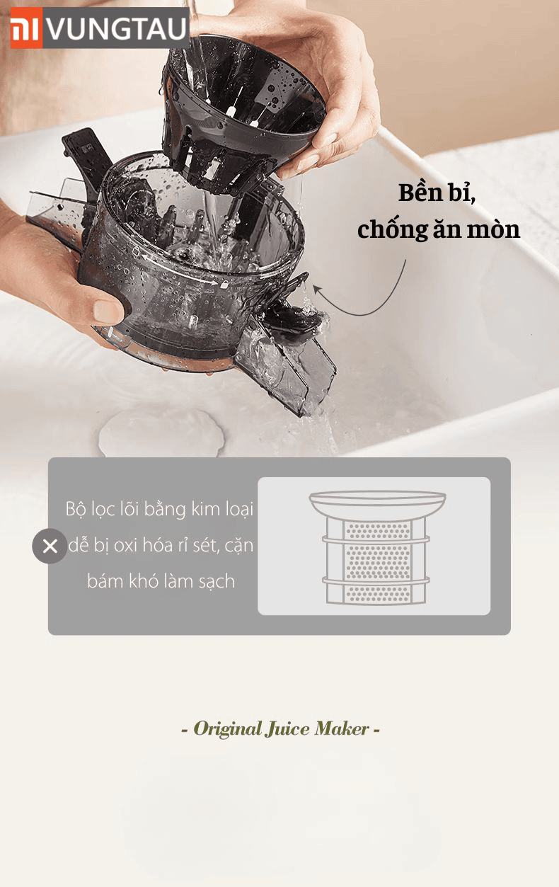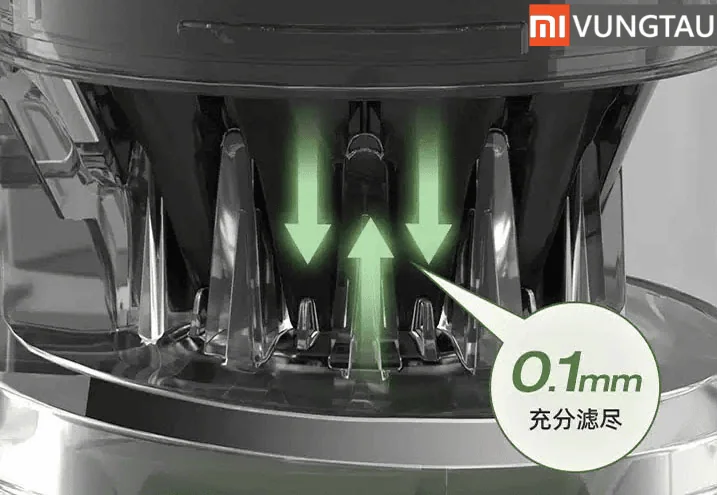 Bộ lọc được thiết kế dưới dạng răng, nước ép và cặn bã sẽ được tự động tách ra mà không cần phải tách thủ công. Thành phẩm nước ép siêu mịn và không có cặn.