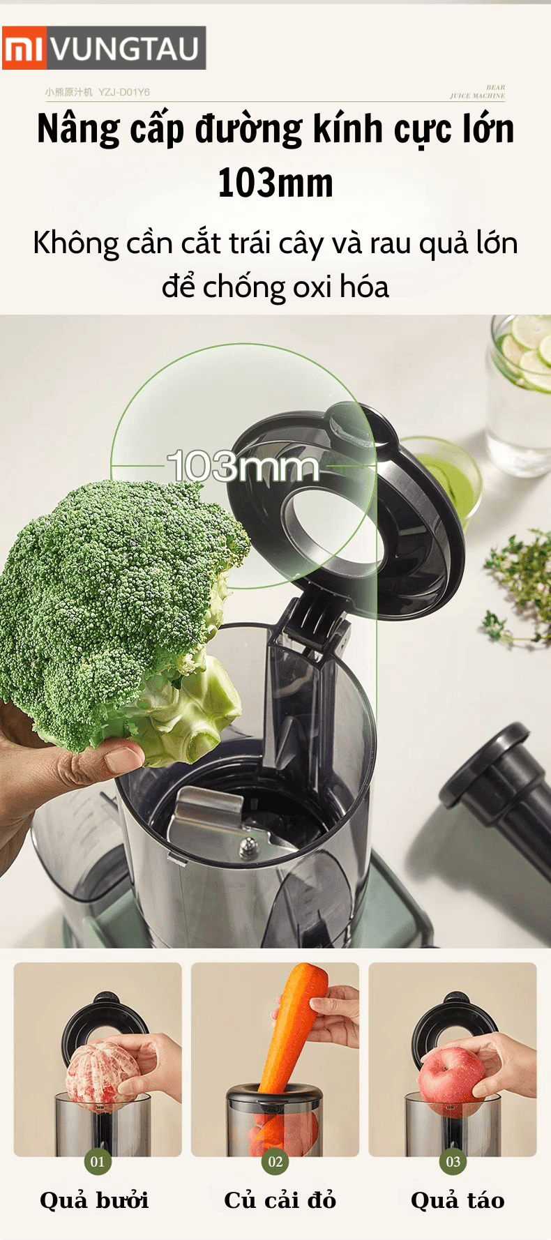 Đường kính miệng máy làm kem, ép trái cây nguyên chất 1L lên đến 103mm. Chính vì vậy, khi ép người dùng không cần phải cắt trái cây rau củ thành khúc nhỏ, tránh được việc oxy hóa các vitamin trong trái cây.