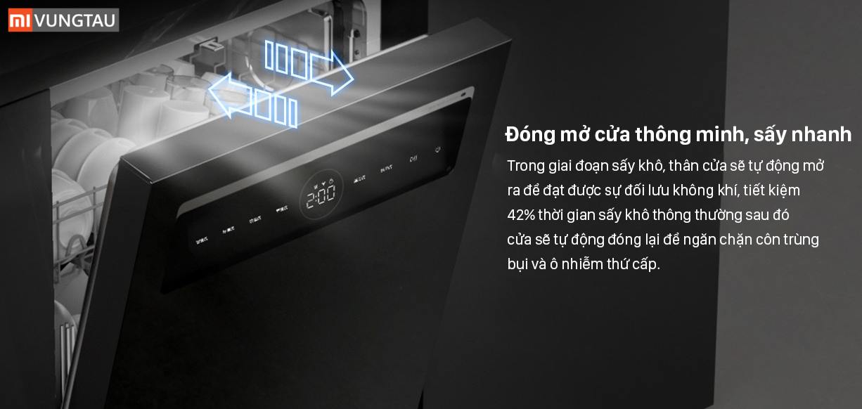 Máy rửa chén bát Xiaomi N1 16 bộ này còn được trang bị cửa công tắc thông minh khi đạt đến điểm cân bằng nhiệt độ và độ ẩm được phát hiện. Máy sẽ tự động mở cửa thêm 4cm, đồng thời kích hoạt bộ phận khí nóng PTC. Dưới tác động của khí nóng, hơi nước ẩm được xả nhanh qua khe cửa so với phương pháp sấy cửa đóng, thời gian sấy tiết kiệm được 40%. Sau khi sấy khô, cửa máy sẽ tự động đóng lại, không cần phải đóng cửa bằng tay và bạn không phải lo lắng về việc quên đóng cửa và những con côn trùng vào, loại bỏ ô nhiễm vào bát đũa.