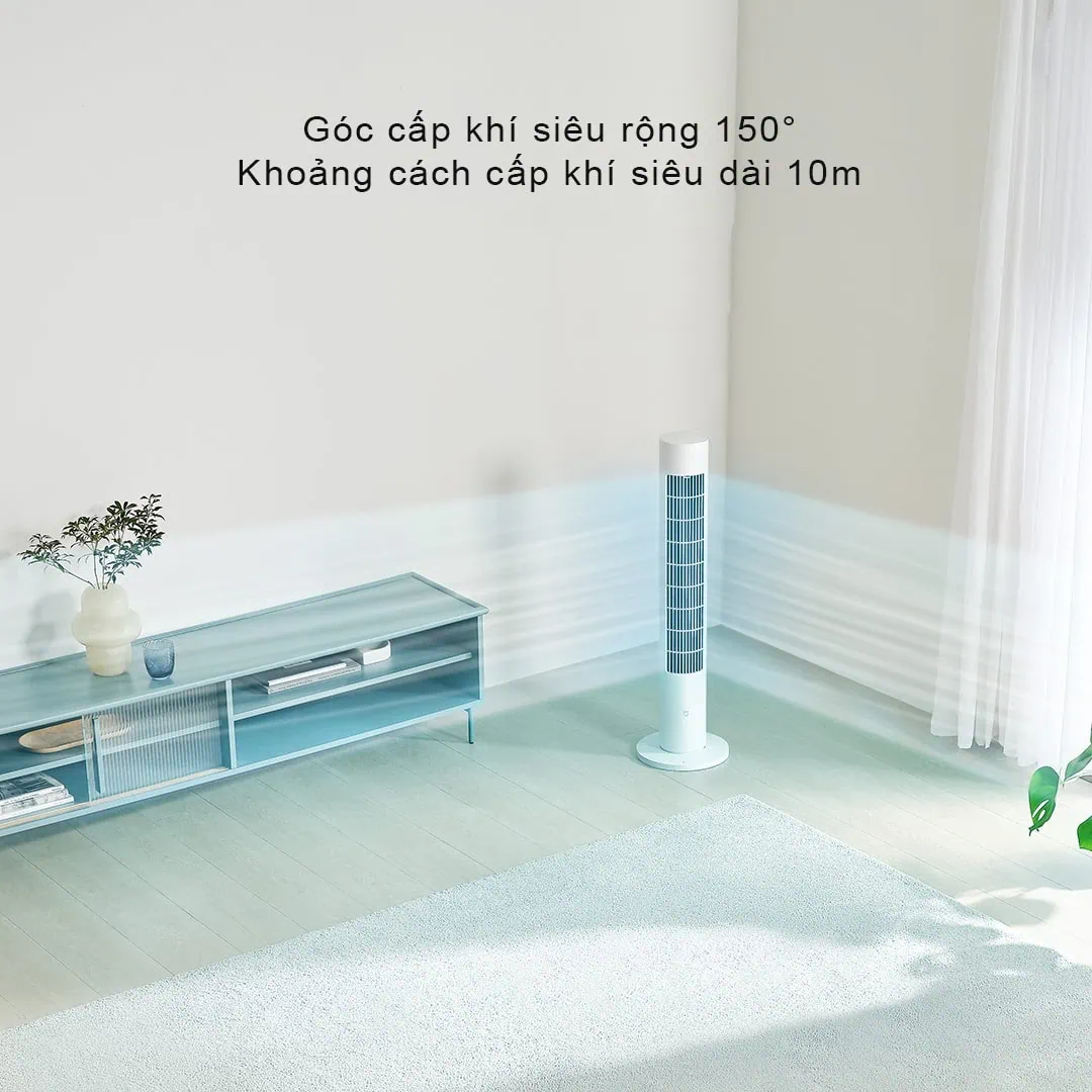 Quạt tháp inverter Xiaomi Mijia BPTS02DM cung cấp làn gió góc siêu rộng đến 150°, giúp tăng tốc luồng khí trong toàn bộ không gian và làm mát nhanh hơn. Đặc biệt, thiết kế dạng tháp cùng với cửa thoát gió dài 0.6m, nên quạt có thể cho khoảng cách làm mát đến 10m. Chính vì vậy, chỉ với 1 chiếc quạt tháp, dù bạn đang ngồi trên sofa hay sàn nhà đều có thể tận hưởng làn gió tự nhiên dễ chịu từ đầu đến chân. Các góc làm mát của quạt cũng có thể được tùy chỉnh dễ dàng thông qua App trên điện thoại.