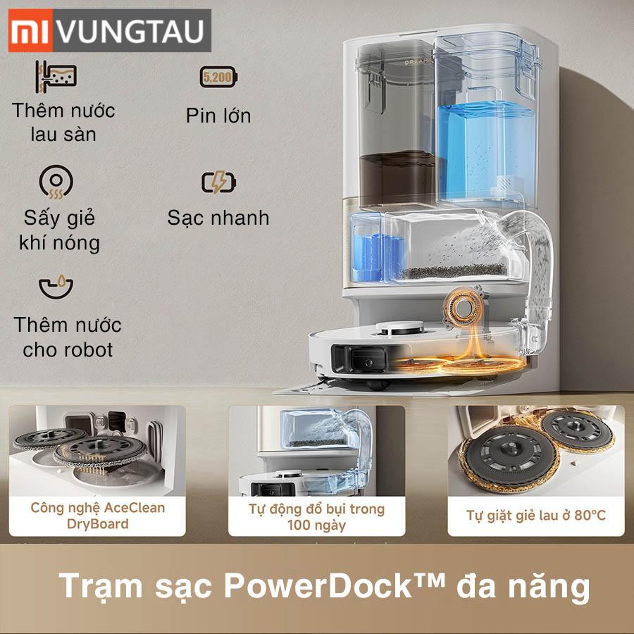 Không chỉ là nơi để sạc pin, PowerDock™ còn là trạm vệ sinh thông minh giúp robot luôn trong trạng thái sẵn sàng làm sạch. Hệ thống 20 vòi phun mạnh mẽ cùng công nghệ AceClean™ DryBoard giúp chà sạch và rửa giẻ lau bằng nước nóng 80°C, loại bỏ tới 99% vết bẩn và vi khuẩn. Trạm sạc còn có thể tự động sấy khô giẻ lau bằng khí nóng, đồng thời đổ rác và nạp nước hoàn toàn tự động.