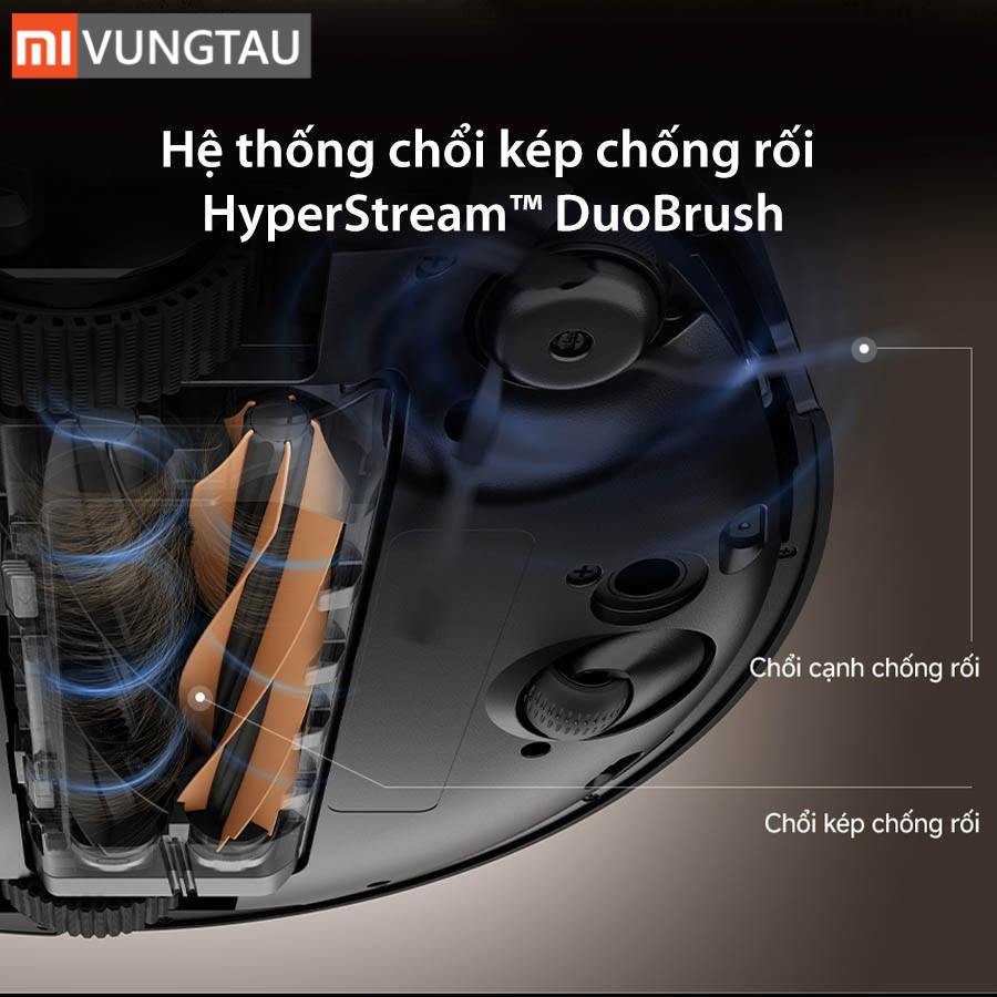 Cấu trúc chổi kép chống rối của hệ thống HyperStream™ DuoBrush gồm một chổi cao su TPU chuyên dụng cho thảm và một chổi lông mềm dành cho sàn cứng, phối hợp cùng lực hút mạnh để xử lý triệt để tóc dài tới 30cm mà không gây tiếng ồn lớn.