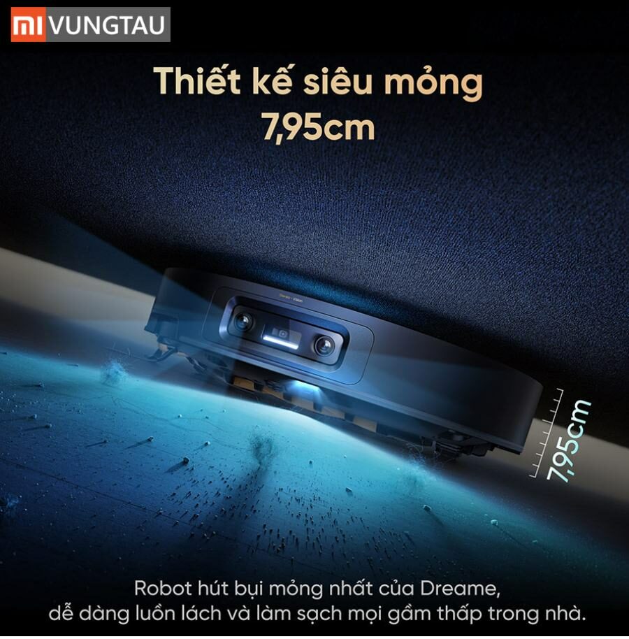 Robot hút bụi lau nhà Dreame X60 Ultra với độ mỏng chỉ 7.95cm nhờ có cấu trúc cảm biến DToF có thể nâng hạ tự động linh hoạt. Với chiều cao tối ưu, robot có thể dễ dàng luồn sâu vào các khu vực thấp như gầm giường, ghế sofa hay tủ, nơi mà hầu hết robot thông thường không thể tiếp cận.