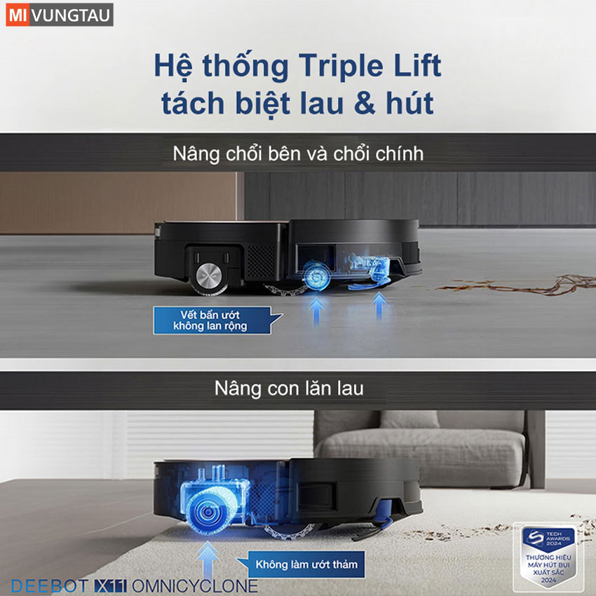 Hệ thống Triple Lift là một trong những cải tiến đột phá của Ecovacs X11 Omni Cyclone, cho phép robot linh hoạt xử lý từng tình huống làm sạch: