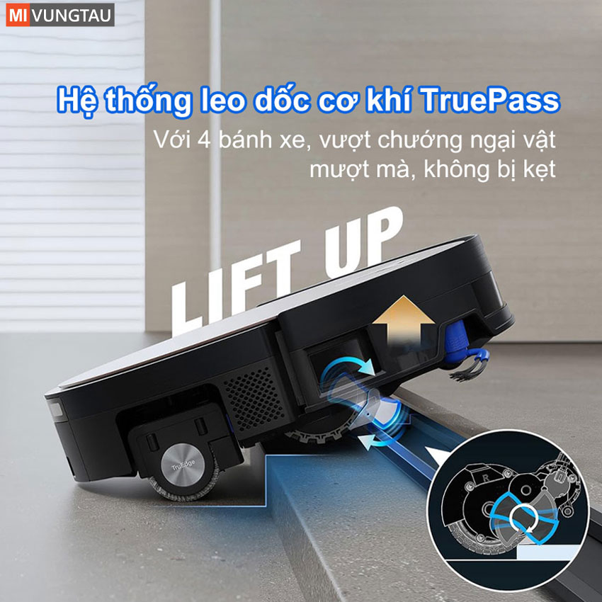 Robot hút bụi lau nhà Ecovacs Deebot X11 OmniCyclone được nâng cấp với hệ thống leo dốc cơ khí 4 bánh TruePass, mang lại khả năng di chuyển mạnh mẽ và ổn định hơn bao giờ hết. Khi gặp ngưỡng cửa hay chướng ngại vật, robot lập tức kích hoạt hai bánh phụ trợ với răng bám cao su mềm, giúp tăng độ bám và nâng cao khả năng vượt chướng ngại.