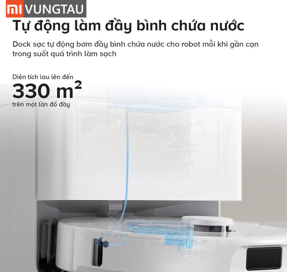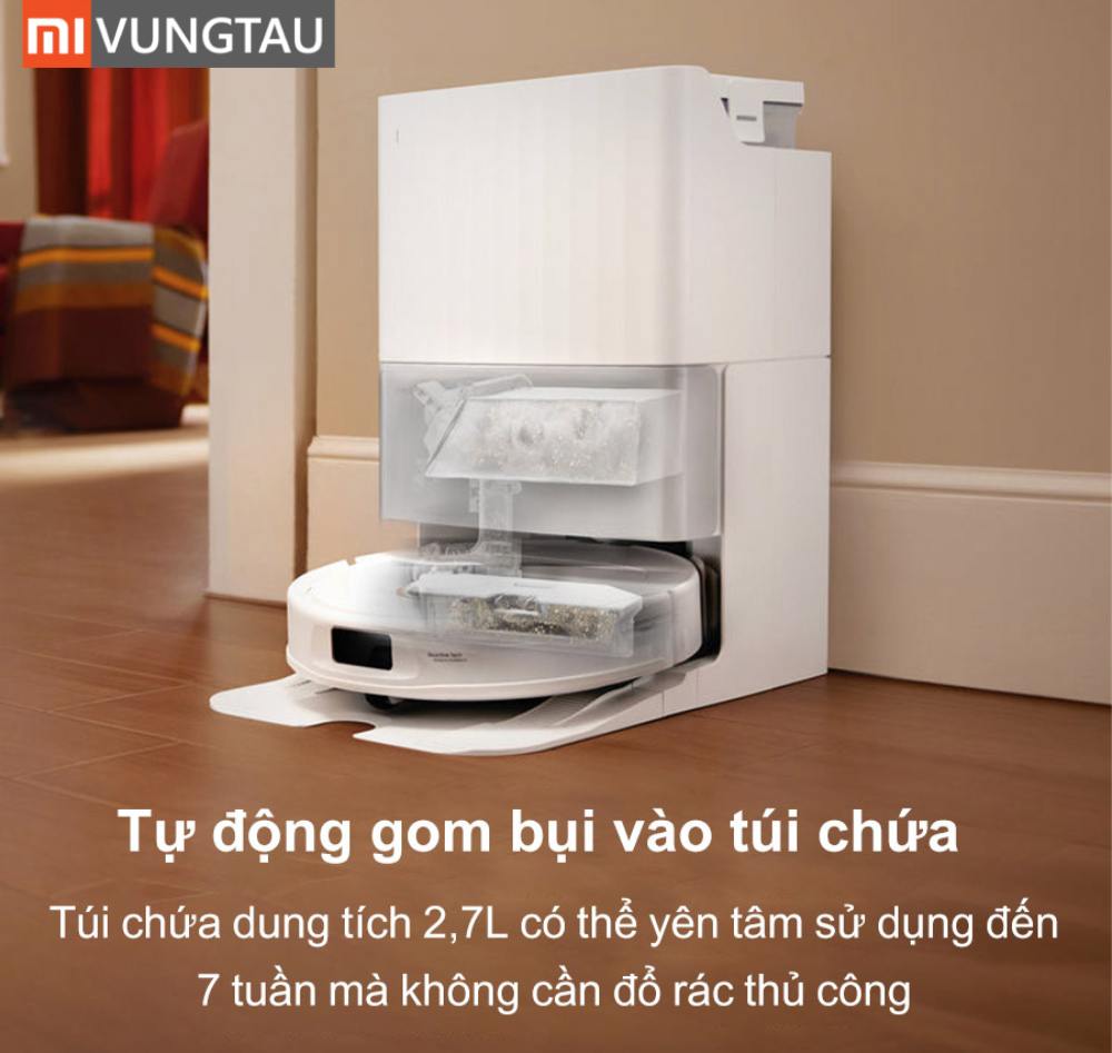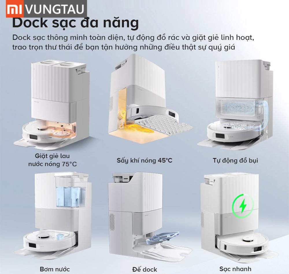 - Trạm sạc đa năng: đổ rác tự động, giặt giẻ nước nóng 75°C, sấy khô khí nóng