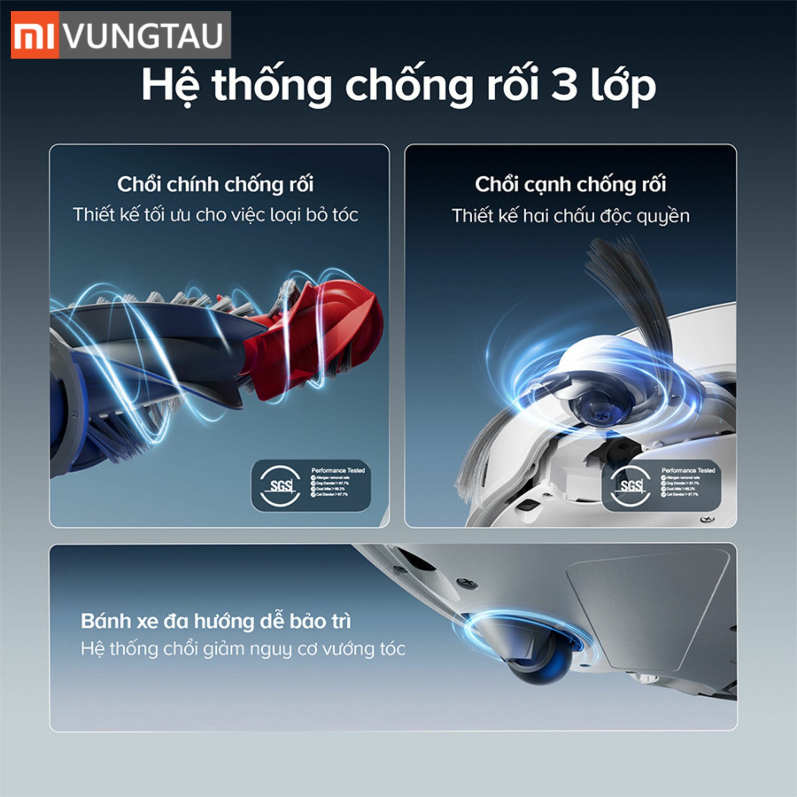 Tóc và lông thú cưng luôn là vấn đề gây khó khăn cho robot hút bụi. Tuy nhiên, với hệ thống chống rối kép Dual Anti-Tangle, thiết bị có thể hạn chế tối đa tình trạng tóc quấn vào chổi chính và các trục quay. Điều này không chỉ giúp robot vận hành ổn định mà còn giảm đáng kể thời gian vệ sinh và bảo trì thủ công.