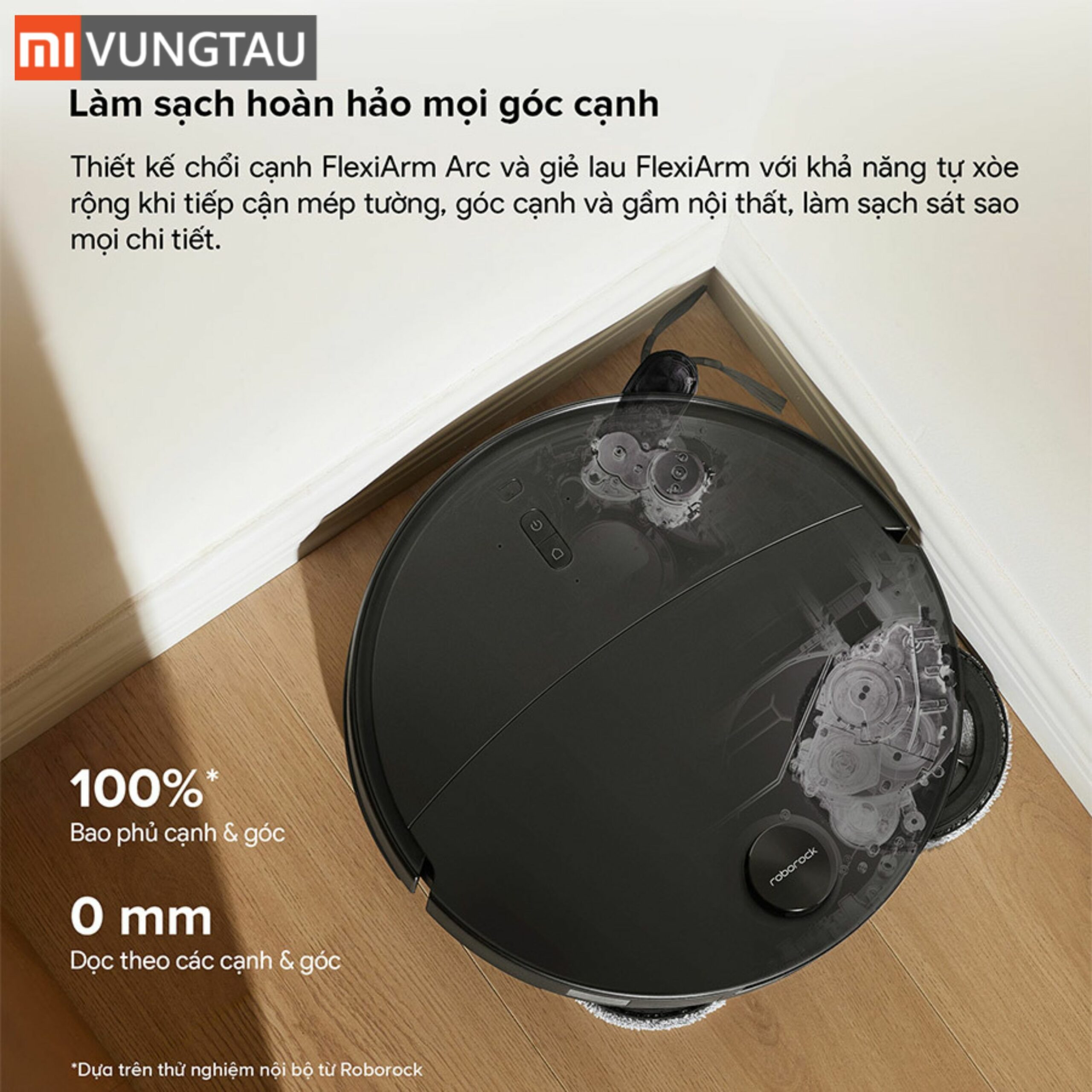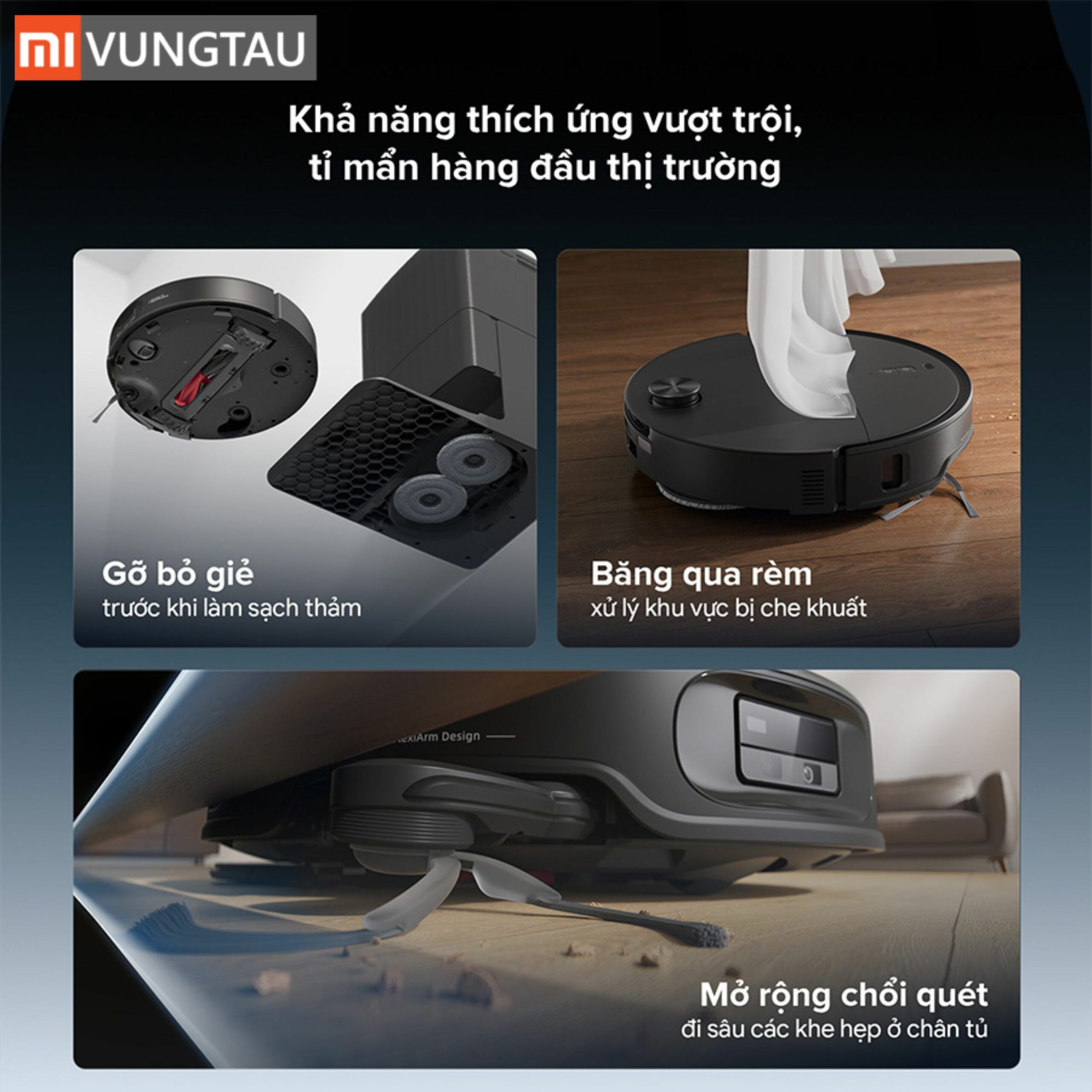 - Cánh tay robot linh hoạt FlexiArm: Tự động xòe cả chổi phụ và giẻ lau để làm sạch triệt để các góc khuất, mép tường.