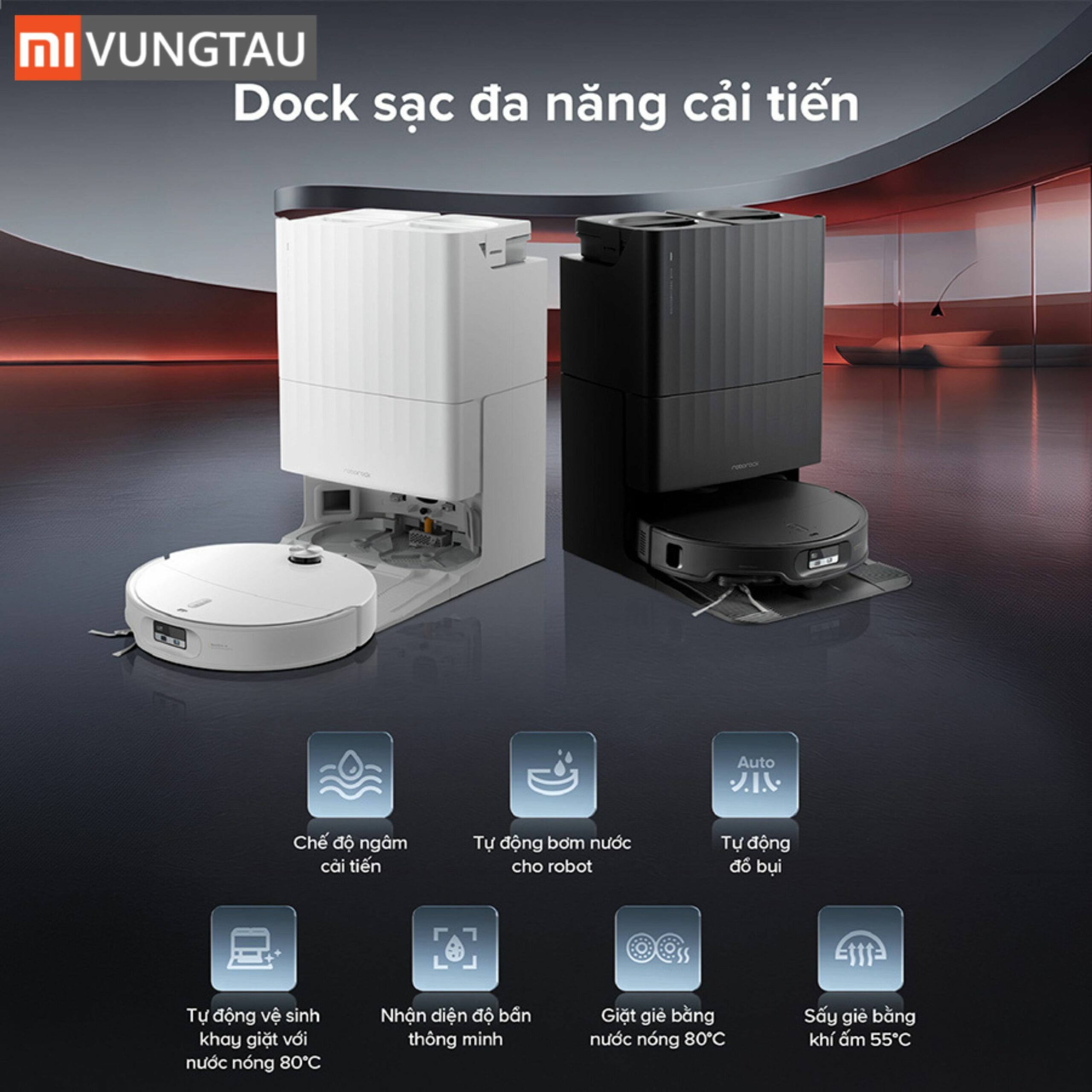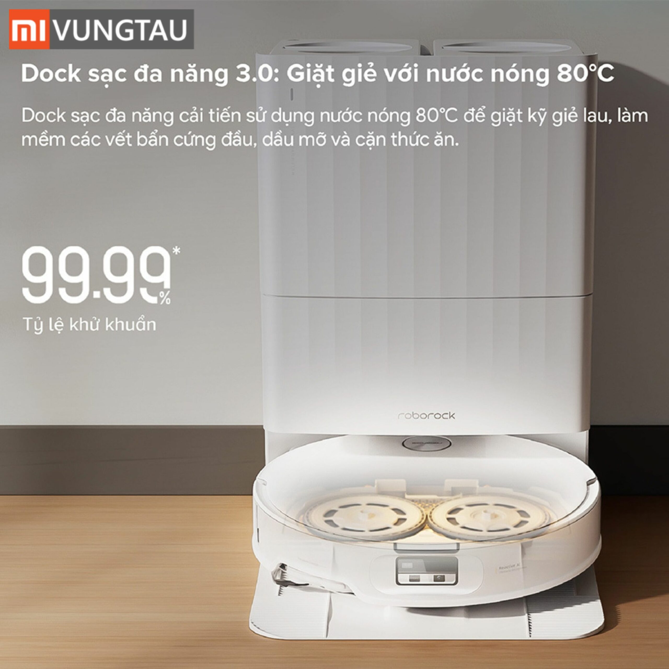 - Trạm sạc All-in-One tiên tiến: Giặt giẻ lau và làm sạch khay giặt bằng nước nóng 80°C, sấy khô bằng khí nóng 55°C.