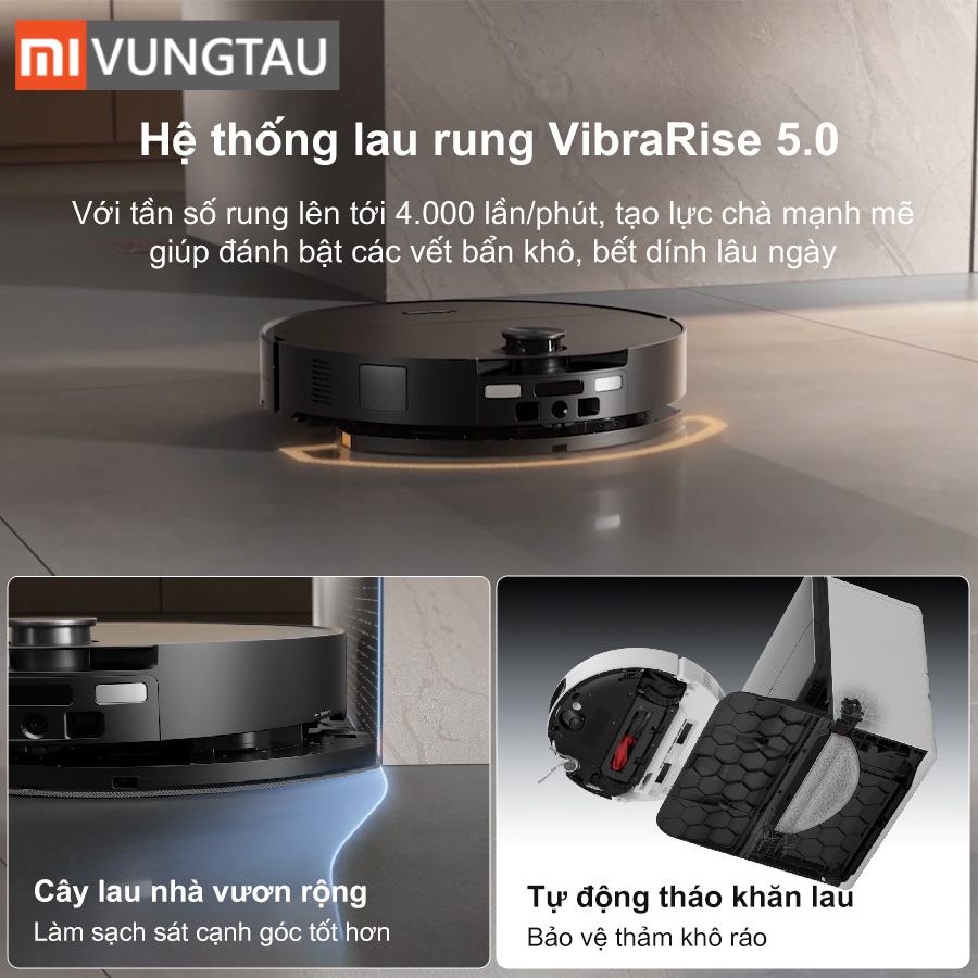 - Tùy biến từng khu vực: Bạn có thể cài đặt lượng nước thấp cho sàn gỗ để bảo vệ sàn, hoặc tăng cường độ rung và nước cho khu vực bếp nhiều dầu mỡ.