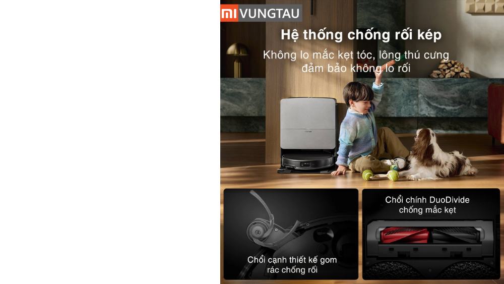 Đây là tính năng lý tưởng cho các gia đình có nuôi thú cưng hoặc thành viên có tóc dài, giúp bạn không còn phải tốn thời gian dùng kéo cắt tóc rối ở chổi sau mỗi lần robot làm việc.