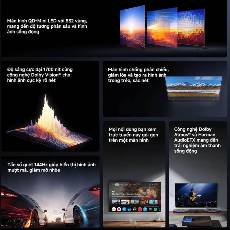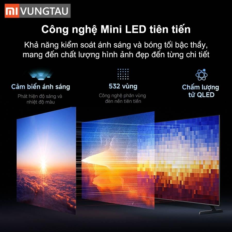 Tivi Xiaomi 65 Inch S Pro Mini LED được trang bị công nghệ màn hình Mini LED tiên tiến với 532 vùng đèn nền độc lập, cho khả năng kiểm soát ánh sáng và bóng tối chính xác đến từng điểm ảnh. Nhờ vậy, các cảnh tối trở nên rõ ràng, sắc nét trong khi những khung hình sáng rực rỡ vẫn giữ được chiều sâu tự nhiên.