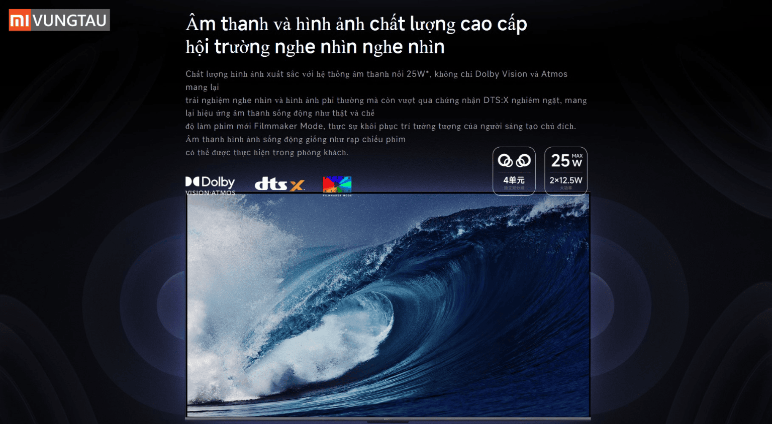 Về chất lượng âm thanh, máy được trang bị hệ thống âm thanh nổi 25W , không chỉ có Dolby Vision và Atmos mang lại trải nghiệm thính giác và hình ảnh vượt trội mà còn đạt chứng nhận DTS:X, mang lại hiệu ứng âm thanh sống động như thật. Âm thanh hình ảnh sống động giống như rạp chiếu phim có thể được thực hiện trong phòng khách.